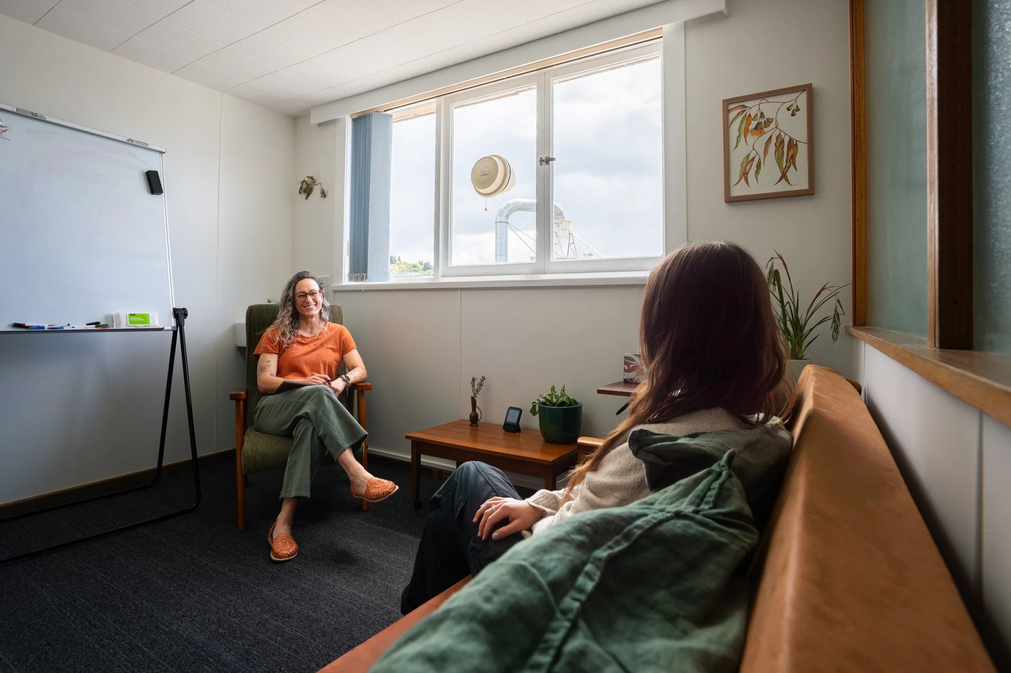 A warm, cosy sit-and-talk room for the sessions where you need to be held still.